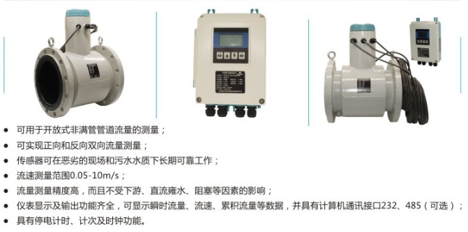 非滿管流量計顯示及輸出功能齊全,可顯示瞬時流量、流速、累積流量等數(shù)據(jù),并具有計算機通訊接口232485(選配件);